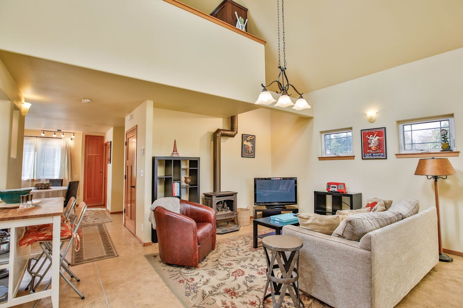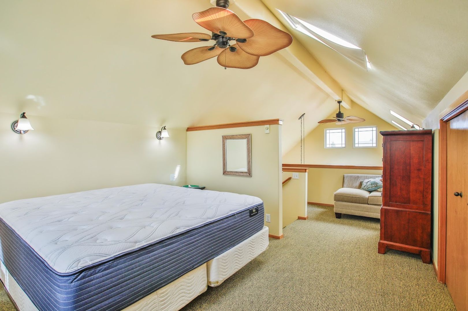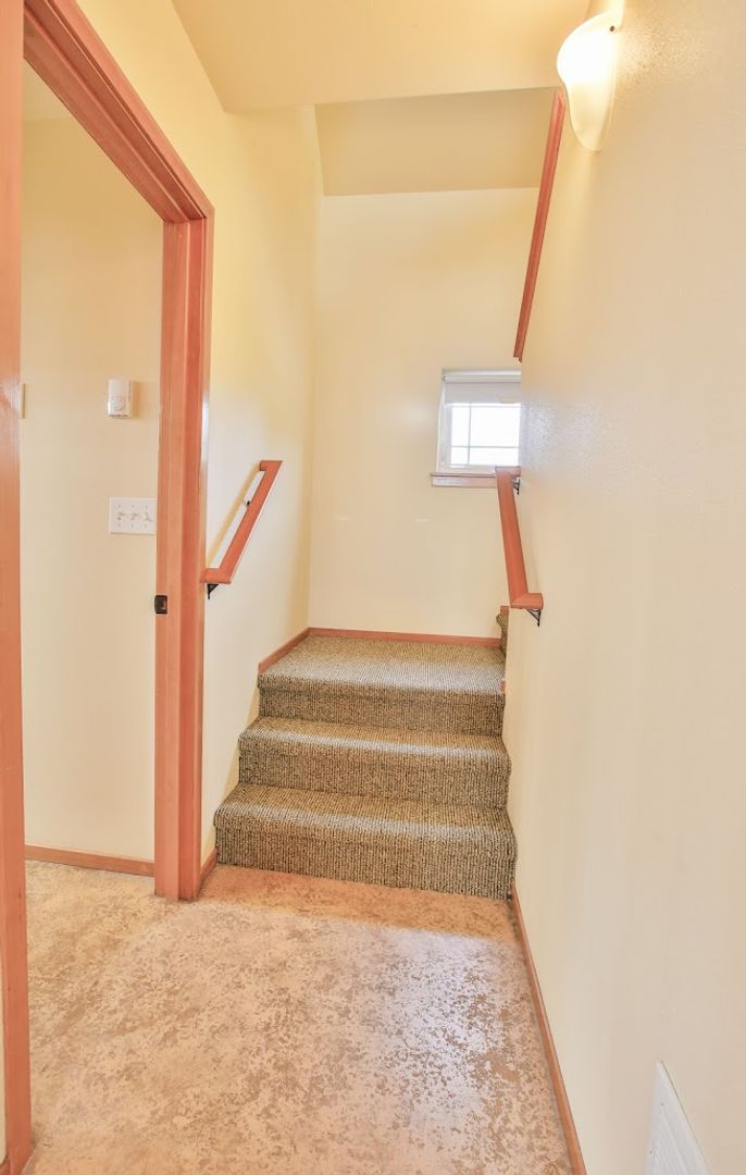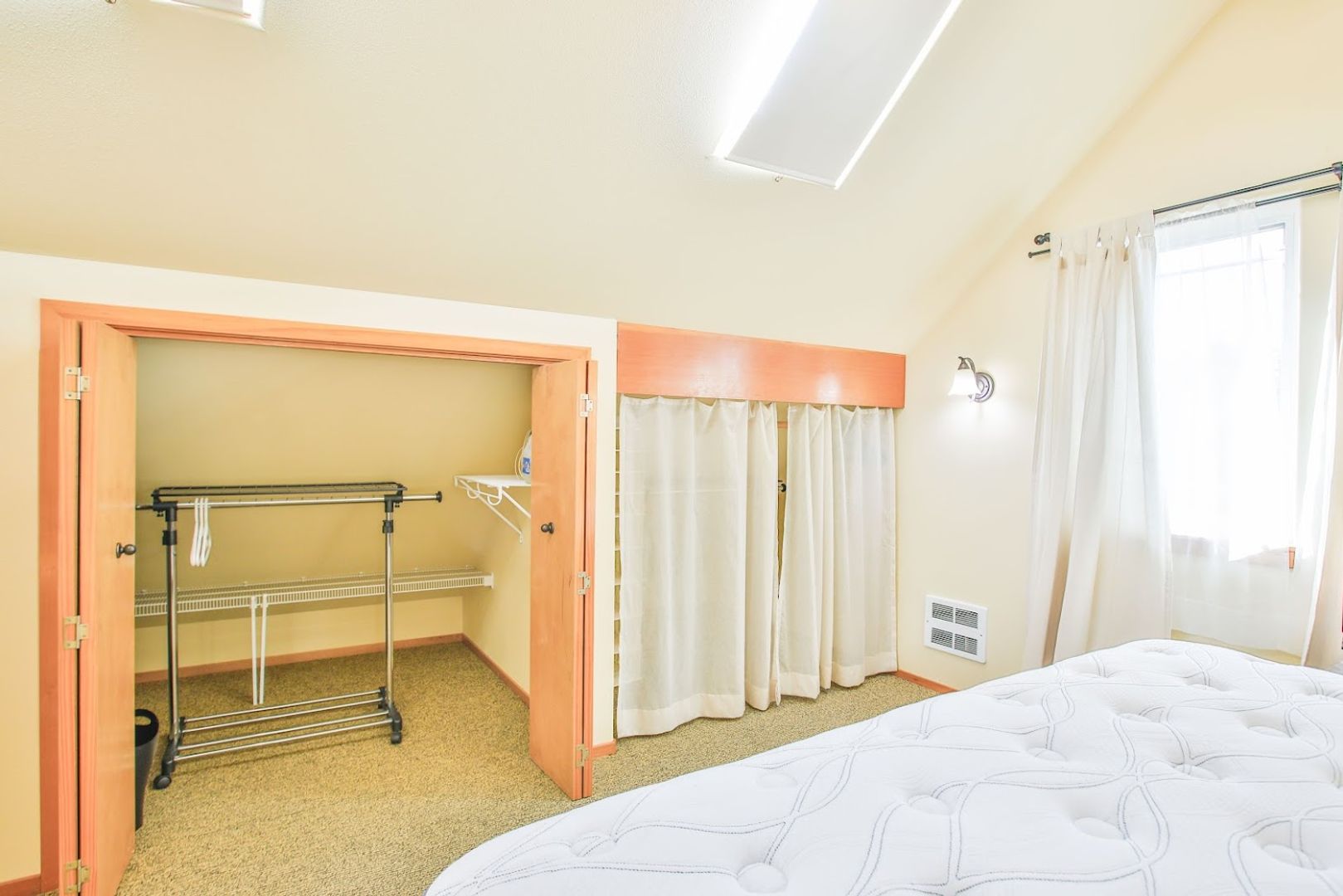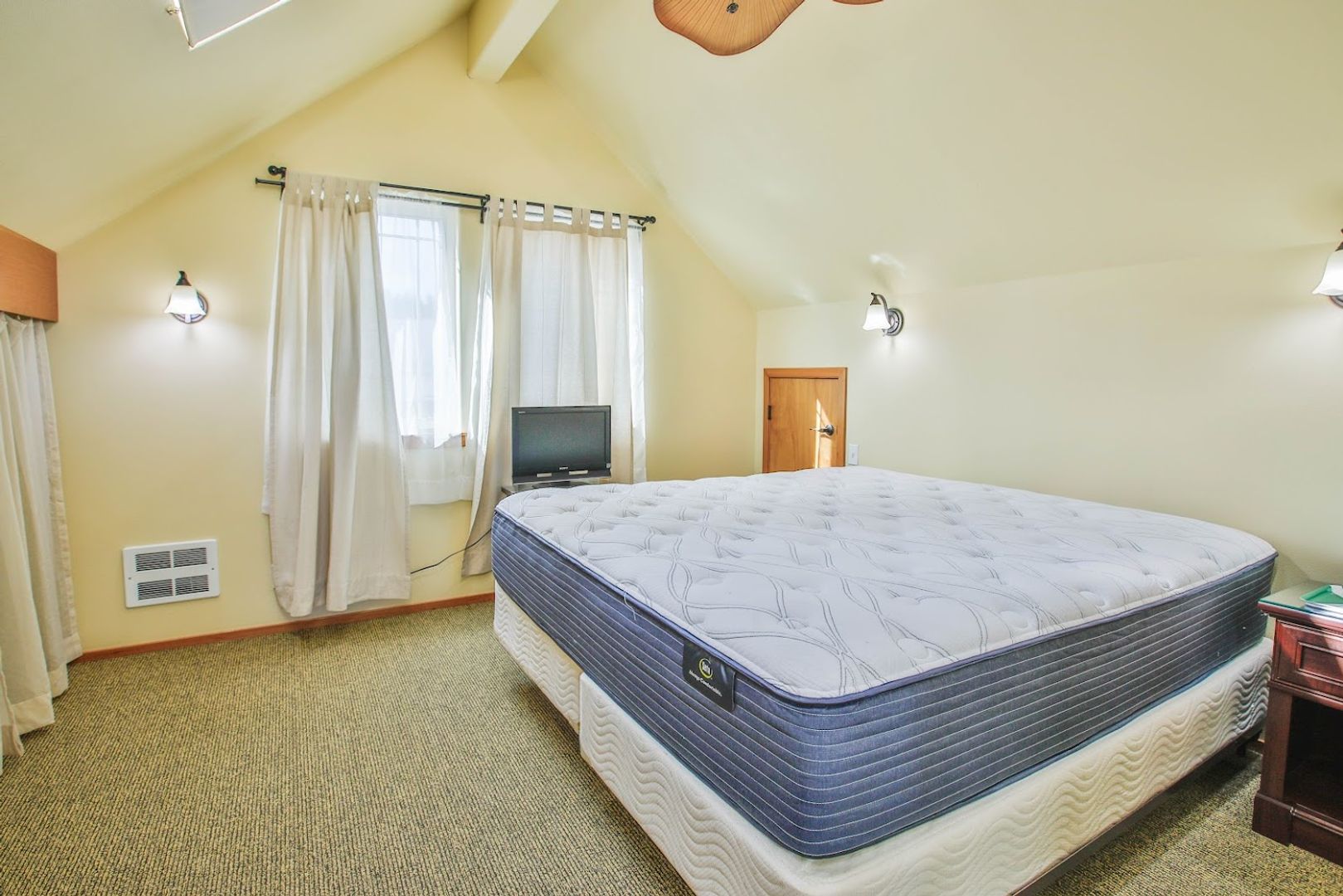 The living room, dining area, kitchen, and bathroom all feature a stylish decorative concrete floor complemented by area rugs. The office is carpeted, as are the stairs and the upstairs bedroom. Additionally, the office includes a convenient coat closet. Every window is equipped with screens, curtains, and privacy drapes, along with some roller shades. The new King mattress is a Serta Classic Elite model. Please note that bedding and linens are not provided. The bedroom boasts four spacious closet areas for hanging clothes, along with a chest of drawers and two bedside tables.