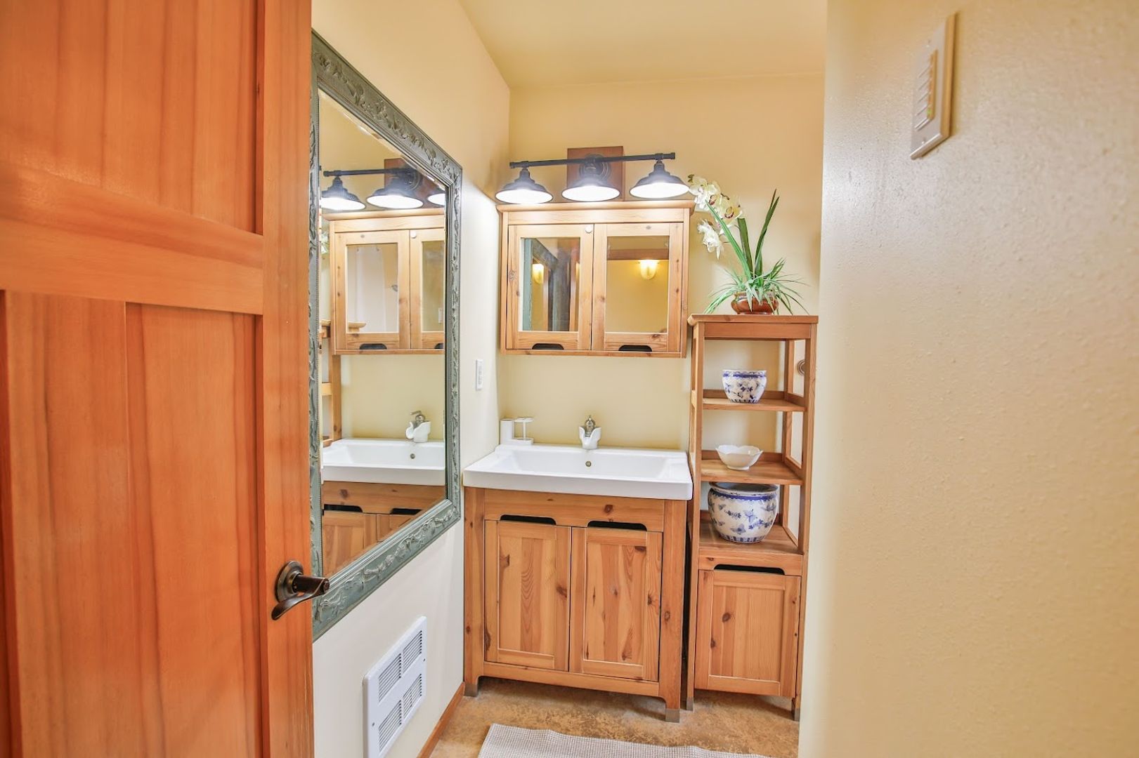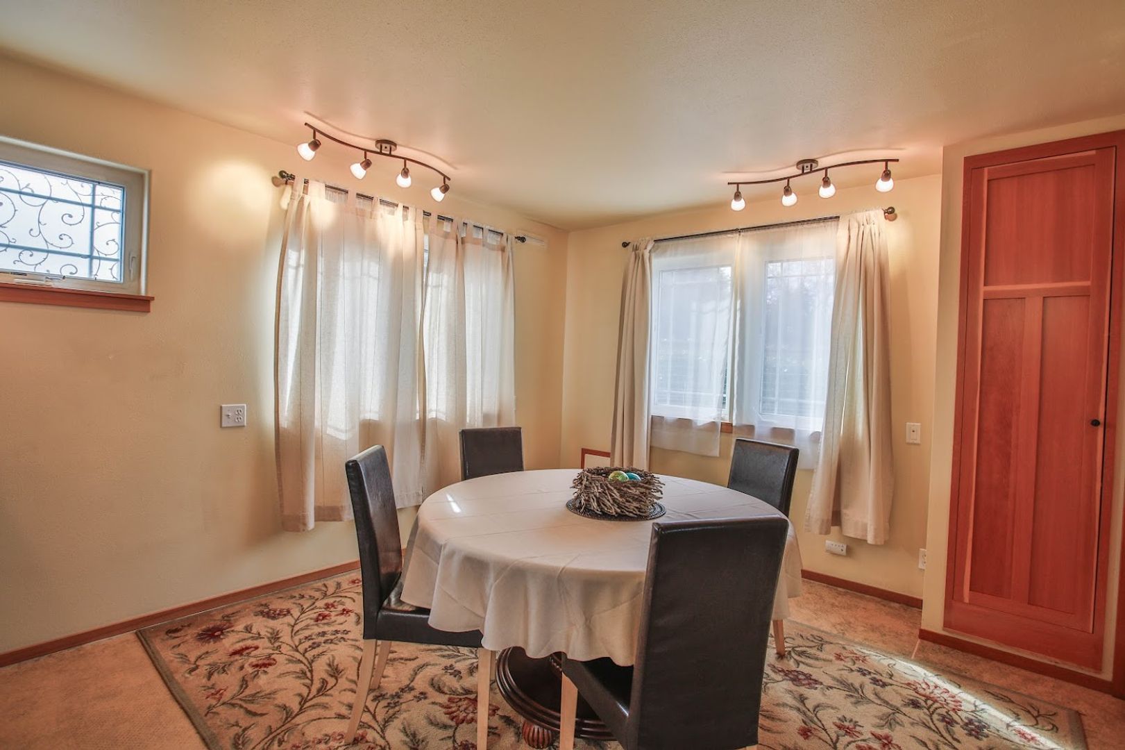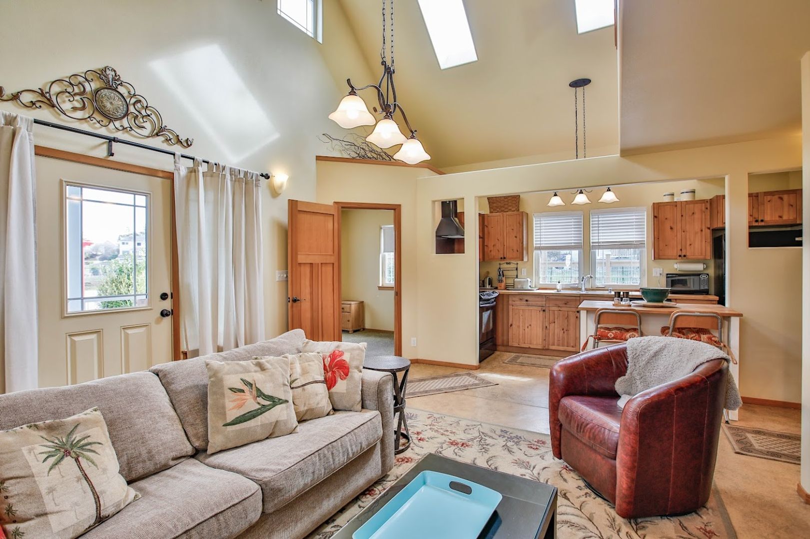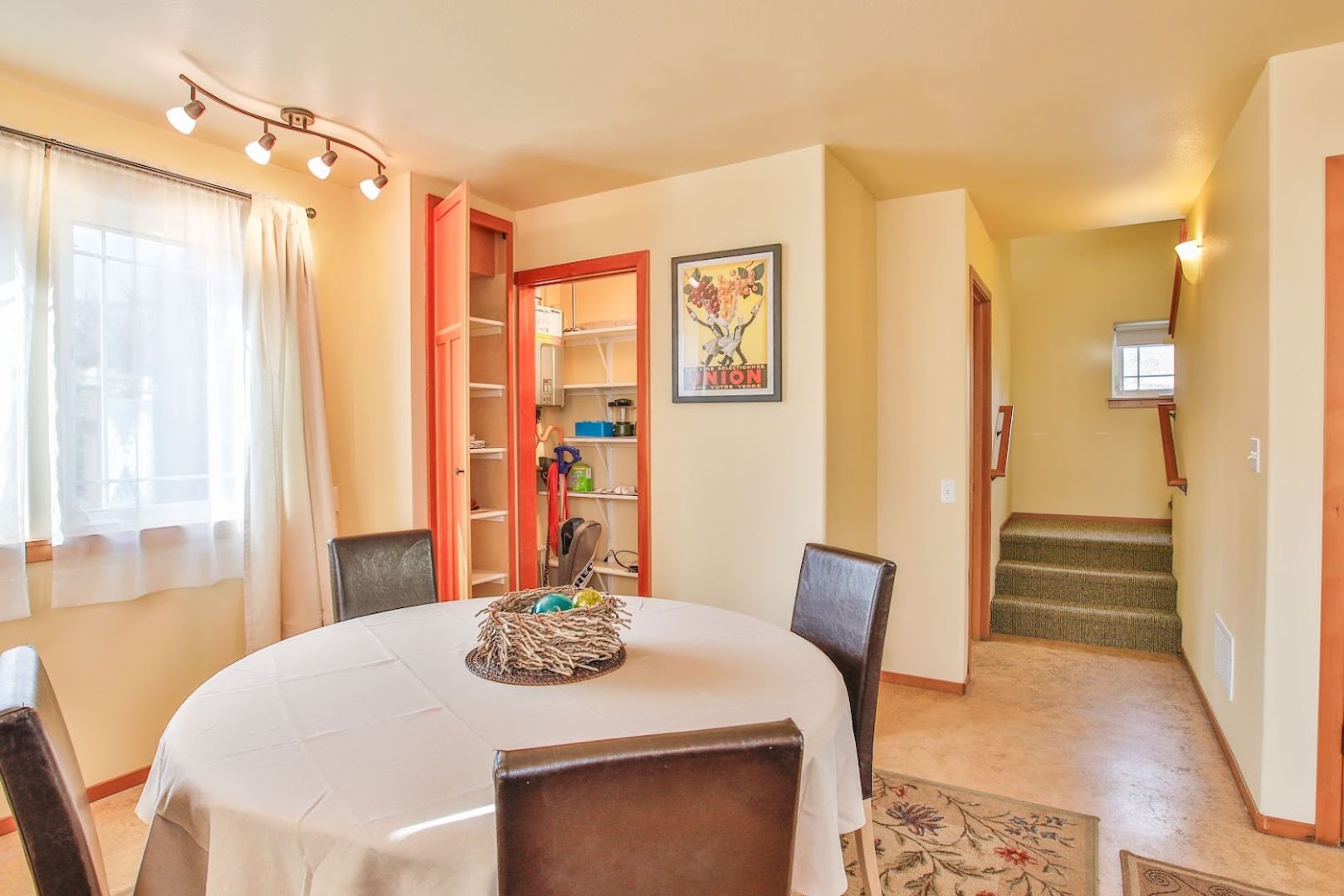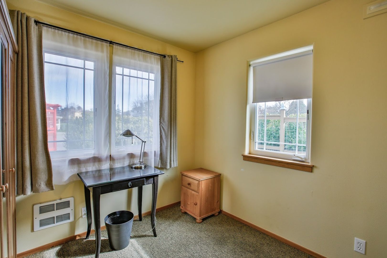 The living room, dining area, kitchen, and bathroom all feature a stylish decorative concrete floor complemented by area rugs. The office is carpeted, as are the stairs and the upstairs bedroom. Additionally, the office includes a convenient coat closet. Every window is equipped with screens, curtains, and privacy drapes, along with some roller shades. The new King mattress is a Serta Classic Elite model. Please note that bedding and linens are not provided. The bedroom boasts four spacious closet areas for hanging clothes, along with a chest of drawers and two bedside tables.