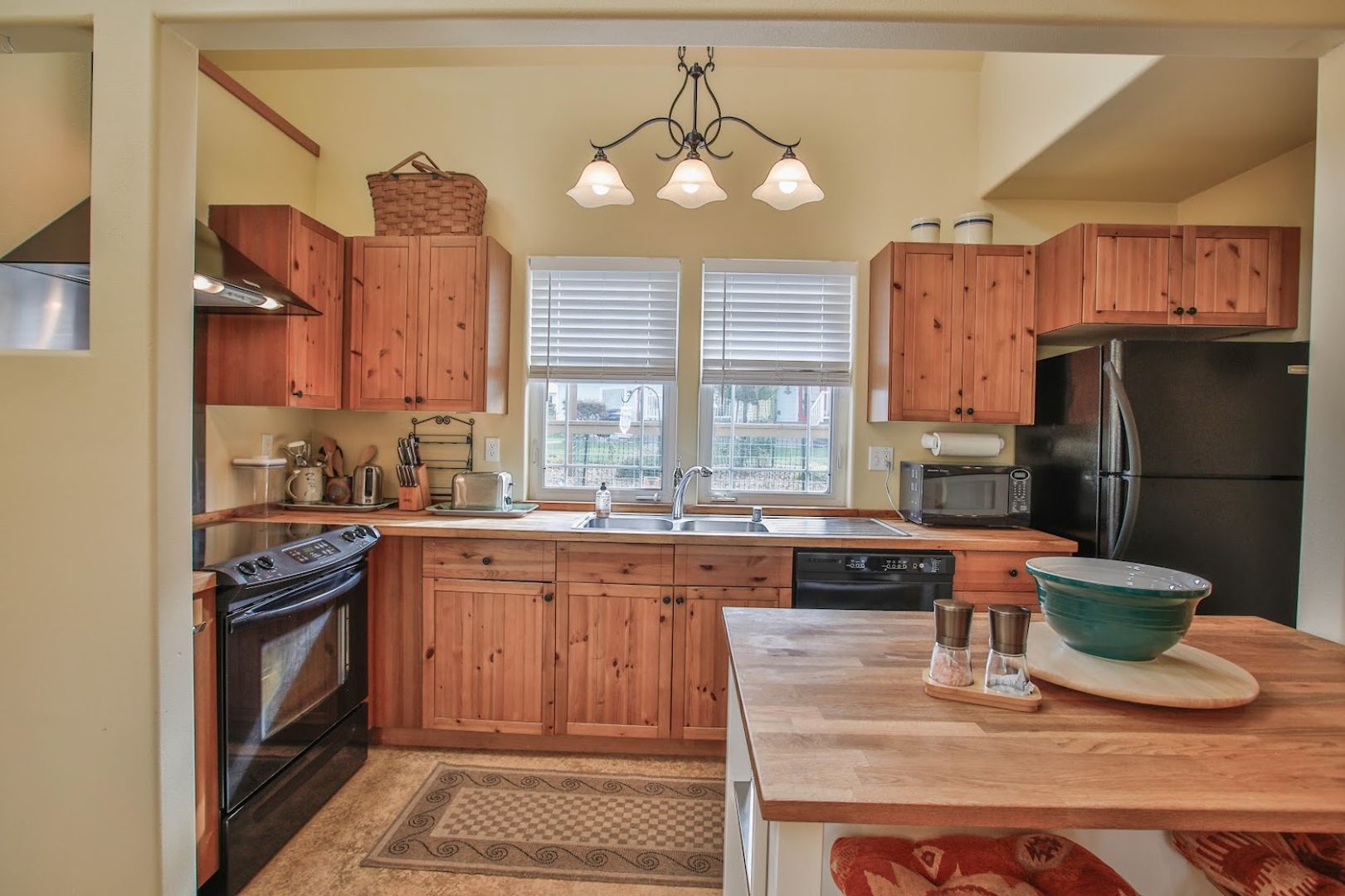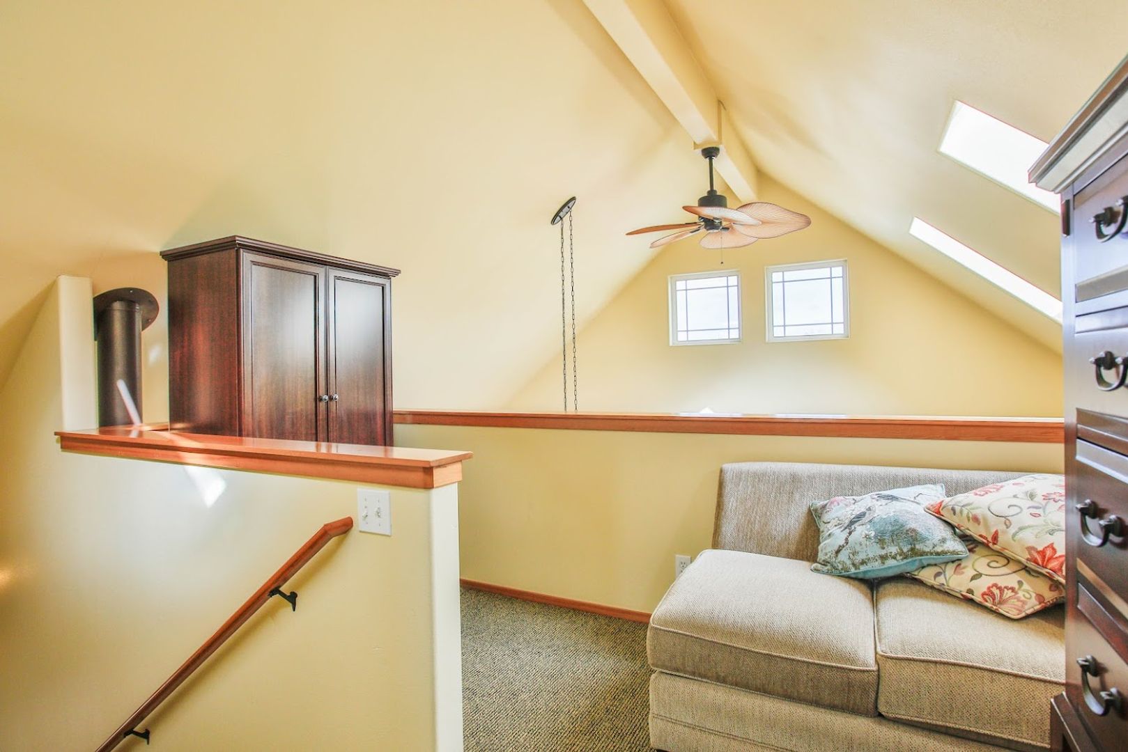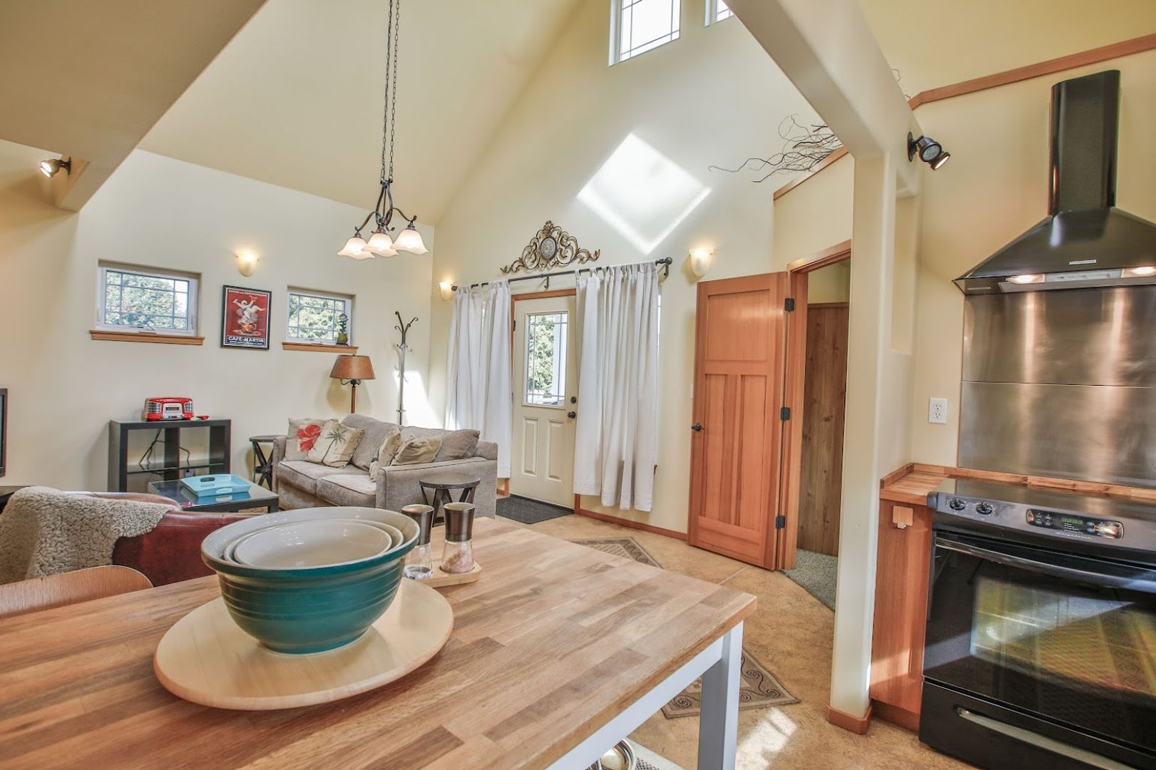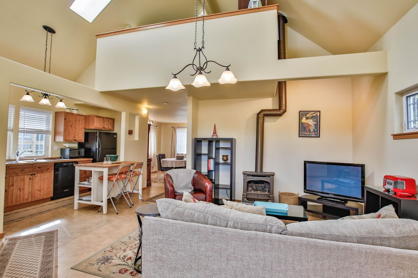 The entryway at the front door features a charming, covered porch with a gate, ideal for year-round relaxation. The living room is bright and roomy, equipped with a large TV, a radio, and cozy seating. It boasts a high cathedral ceiling, and a romantic bedroom is located on the second floor, providing a view of the living and kitchen spaces. The cottage's south-facing roof includes four skylights. The kitchen features an "open" design with IKEA cabinets and hardwood countertops. The stove is equipped with a glass top. Additionally, there is a work island, refrigerator, waste disposal unit, and dishwasher, along with a spacious, well-lit pantry and storage area. The lighting is both pleasant and decorative.